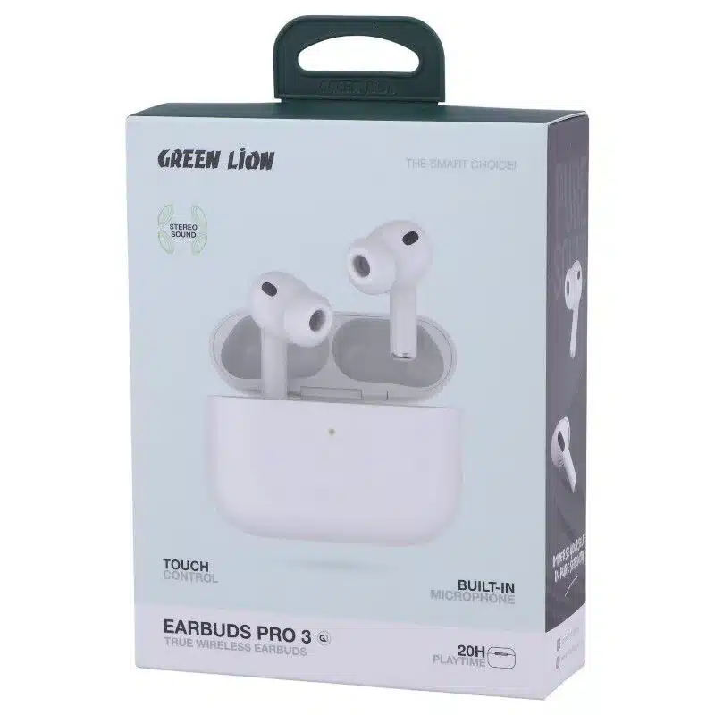 The Green Lion Earbuds Pro 3 are true wireless earbuds featuring stereo sound and a built-in microph